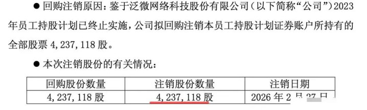 软件龙头,直接回购注销423.7万股,2月27日就办完。注销是什么意思?这部分股票从市场永久消失,剩下的每股含金量直接提升。泛微网络做协同办公软件,客户全是政府和大企业,业绩稳得一批。去年净利润3亿多,现金流充沛,回购注销是真舍得。