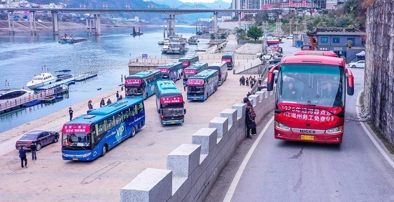 上午9时,乌江旅游码头是人头攒动,暖意融融。来自23个乡镇(街道)的外出务工群众带着行李,在工作人员的引导下排队候车。现场,10辆悬挂着“‘点对点’组织输送”横幅的大巴车整装待发,它们将载着沿河儿女奔赴广东东莞、佛山及浙江温州等地,开启新一年的奋斗征程。