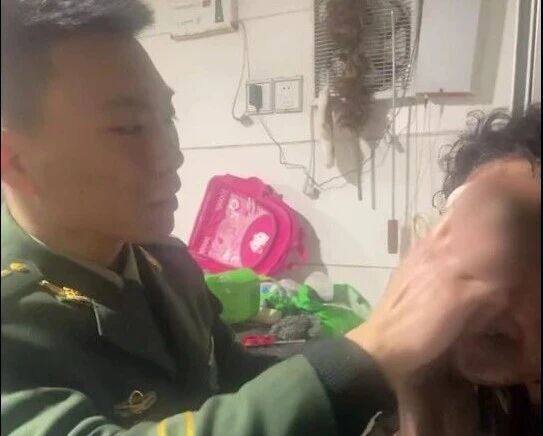 当看到老人脸上沾满黑烟时,他又细心搀扶老人去水池,耐心帮老人清洗,用细致的举动温暖着惊魂未定的一家人。